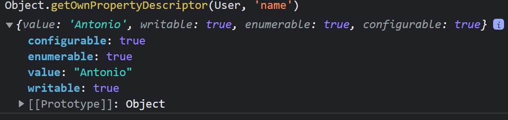 Ahora, si usamos la función Object.getOwnPropertyDescriptor podemos obtener el PropertyDescriptor de la propiedad de cualquier objeto. Por ejemplo, de nuestro objeto User de antes: