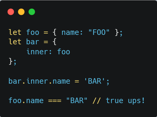 Observamos como la mutación de las propiedades del objeto inner son las propiedades del objeto foo, puesto que la propiedad inner almacenó una referencia cuando se definió.