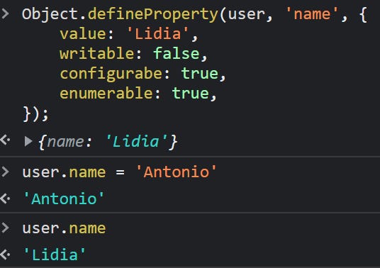 Para ello se utiliza la utilidad Object.defineProperty que nos permite crear una propiedad mediante un descriptor y así poder configurar los valores arriba expuestos.